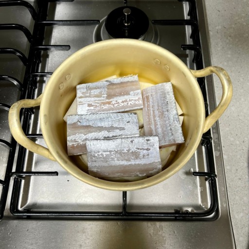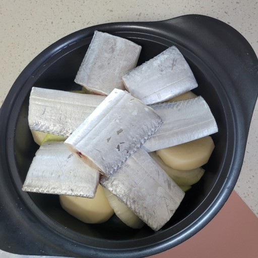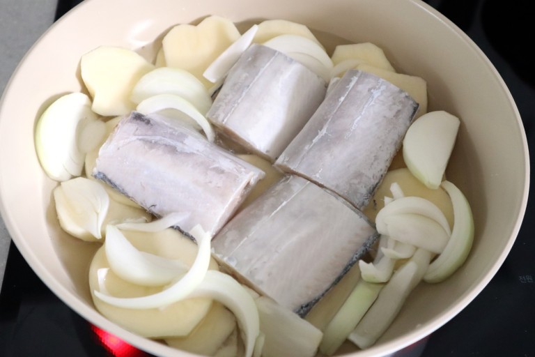 - 냄비에 양파, 우린 무, 단호박 순으로 바닥에 깔고 깔치를 채소위에 올려줍니다.