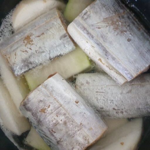 - 무를 젓가락으로 찔러보아 들어갈 정도가 되면 그 위에 갈치를 얹고 양념을 골고루 끼얹습니다.