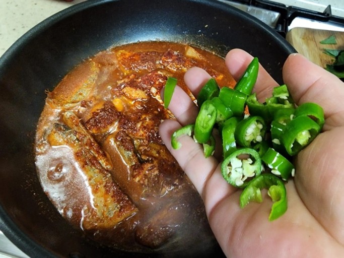 - 풋고추ㆍ홍고추와 대파를 넣고 중불에서 갈치가 익을 때까지 국물을 끼얹어가며 뚜껑을 연 채로 국물이 자작해질 때까지 조립니다.