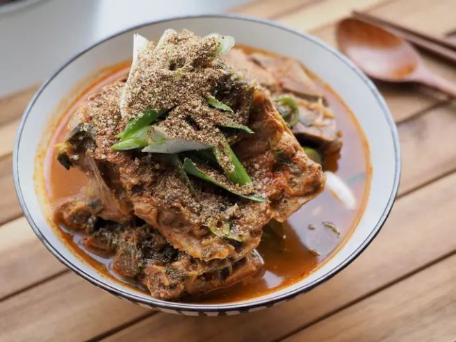- 우거지는 먹기 좋은 크기로 잘라요. 우거지를 볼에 담고 고춧가루 1큰술, 된장 2큰술을 넣고 무쳐요. 마늘 1큰술 반, 간장 3큰술, 후추 1/2작은술 설탕 1큰술, 고춧가루 5큰술, 된장 3큰술 돼지 생등뼈 초벌 삶기(20분) 돼지생등뼈를 흐르는 물에 깨끗이 씻어요.