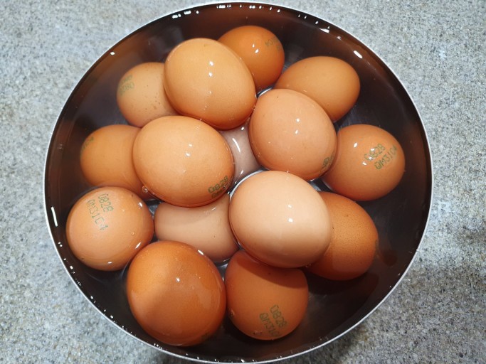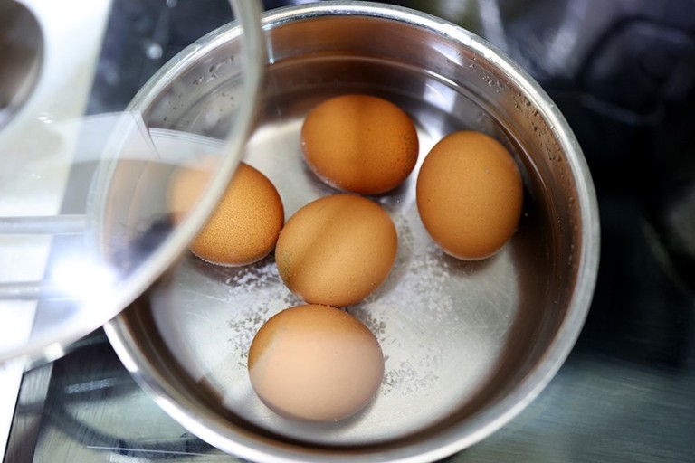 계란을 삶고 나서 곧바로 찬물(얼음물)에 담가주면 껍질을 훨씬 수월하게 벗겨서 드실 수 있다.