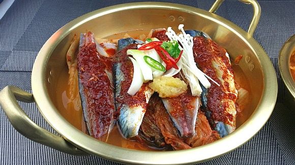 - 그릇에 담은 후 이 육수를 위에 뿌릴 겁니다. 익은 김치를 바닥에 깔고, 그 위로 고등어를 얹었습니다.