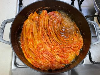 - 큰 냄비에 물에 씻은 김치를 넣어 주세요.