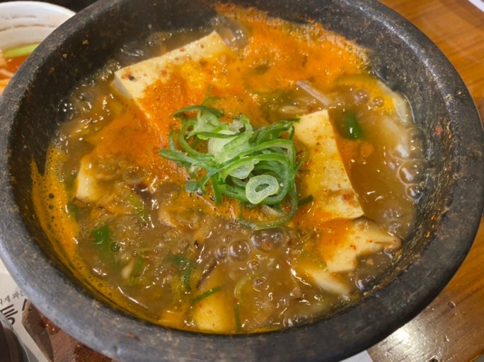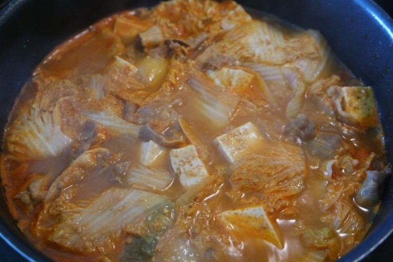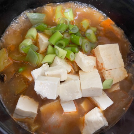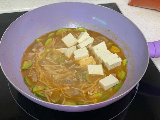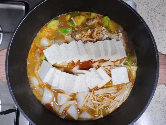- 끓어오르면 간 마늘 1스푼과 썬 두부도 투하시켜 준 뒤 5분 정도 중 약불에 끓여 주세요.
