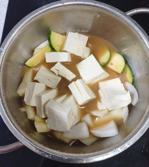 된장찌개 맛있게 끓이는 방법 - 채소만 들어간 상태로 된장찌개를 끓여줬다면 감자 표면이 익은 것을 관찰할 수 있을 것입니다.