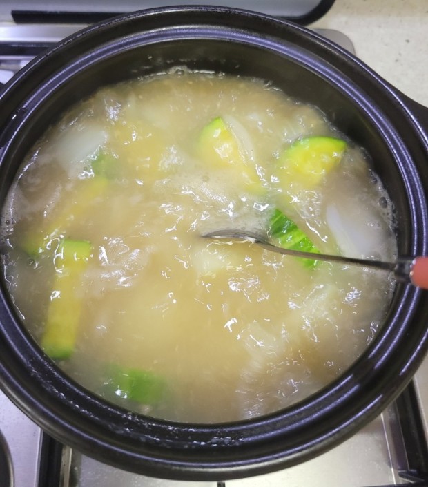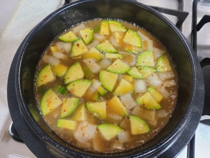 - 다진 마늘 두 스푼을 넣어주세요 준비한 감자와 애호박을 넣어주세요