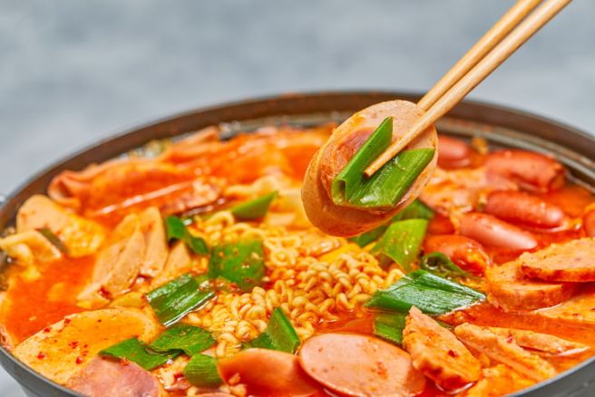 재료 : 물 3컵(540ml) 통조림햄 1캔(200g) 대파 1과 1/2대(150g) 소시지 2개(95g) 양파 ¼개(60g) 신김치 약 1/3컵(50g) 베이크드빈스 1과 1/2큰술(30g) 체다슬라이스치즈 1장(20g)