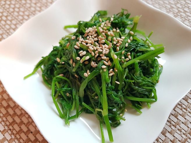 - 조물조물 무친 세발나물에 참기름 1/4 숟가락과 참깨를 넣어 다시 무치면 됩니다.