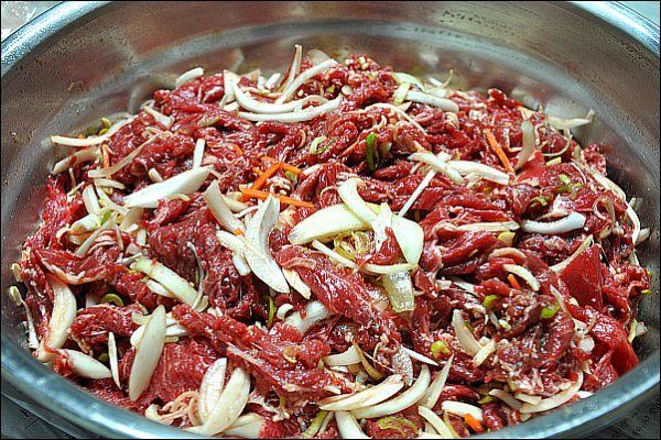 재료 : 불고기용 쇠고기 600g 진간장 10 큰술 설탕 2 큰술 물엿 2 큰 술잔 음료 한 캔 238ml 소금 1/2 작은술 참기름 3 큰술 식초 2 큰술 다진 마늘 1.5 큰술 대파 1개 식용 기름 참기름 조금 참기름 조금