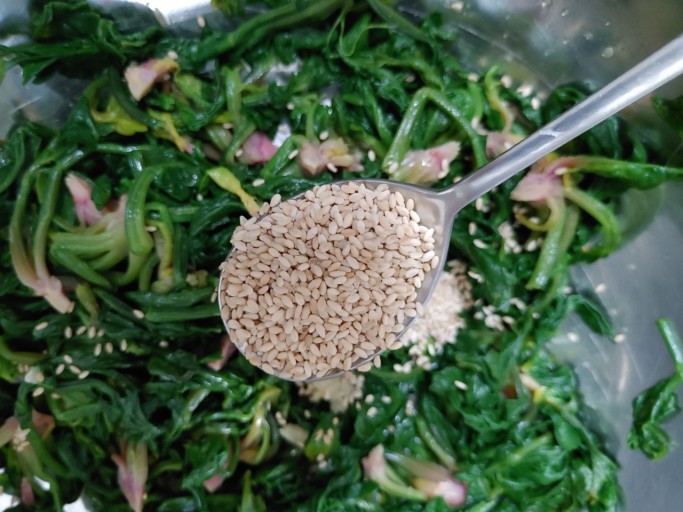 - 참기름 1작은술과 깻가루 1작은술을 넣고 가볍게 무쳐 주면 완성입니다.