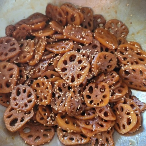 - 불을 끈 뒤 참기름(2큰술)정도를 부어 뒤적여 마무리하게 되면 백종원 연근조림 만드는 방법이 완성됩니다.