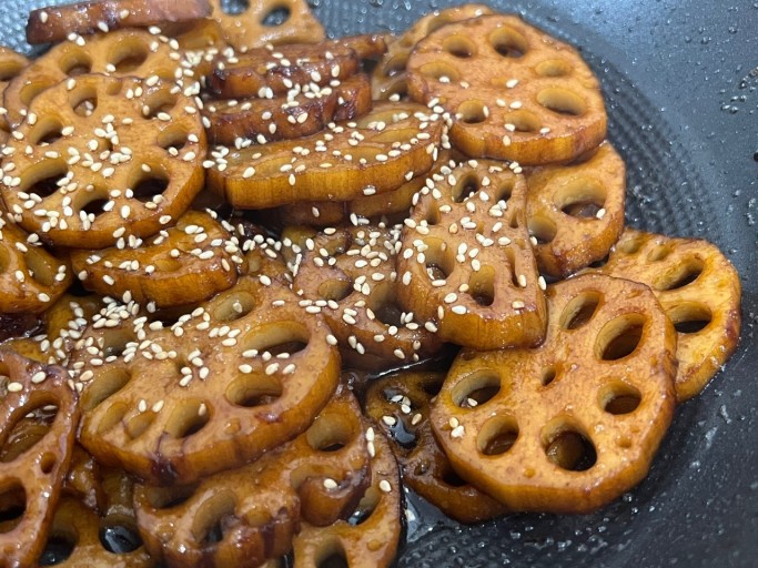 - 계량스푼 기준으로 통깨 1큰술을 넣으면 맛있는 연근조림이 완성돼요.