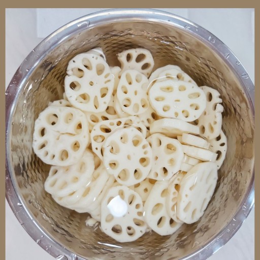 - 껍질 벗긴 연근을 3~4mm 두께로 자른 후 바로 찬물에 담급니다.