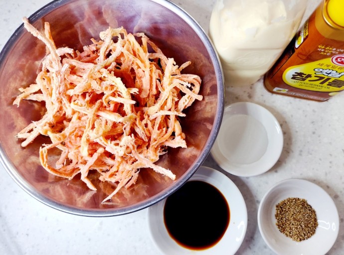 - 오징어채는 채에 걸러 불순물을 빼 준다.