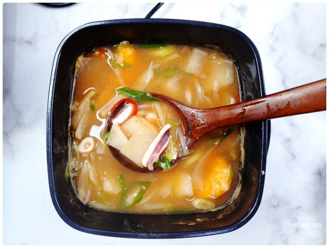 - 시원하고 얼큰한 오징어뭇국 끓이는 법으로 맛있는 아침국, 해장국 오징어국이 완성되었습니다.