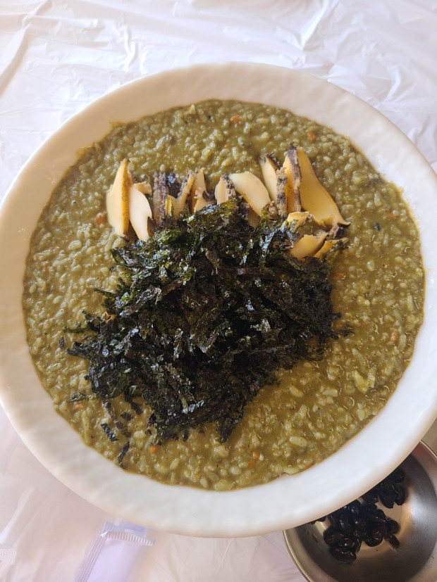 - 어느 정도 걸 축한 느낌의 죽이 완성되었으면 먹기 좋게 그릇에 담아내고 전복 살을 올려 준 다음 깨와 마지막 참기름을 살짝 얹어 마무리한다.
