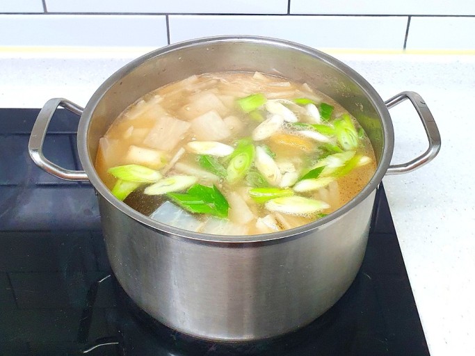육수 재료: 무 한 토막, 양파 반 개, 자른 다시마 5~6개, 대파 약간